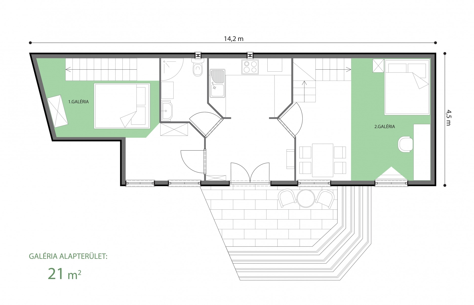 2 szoba, 2 háló galéria, fürdőszoba, előszoba, konyha