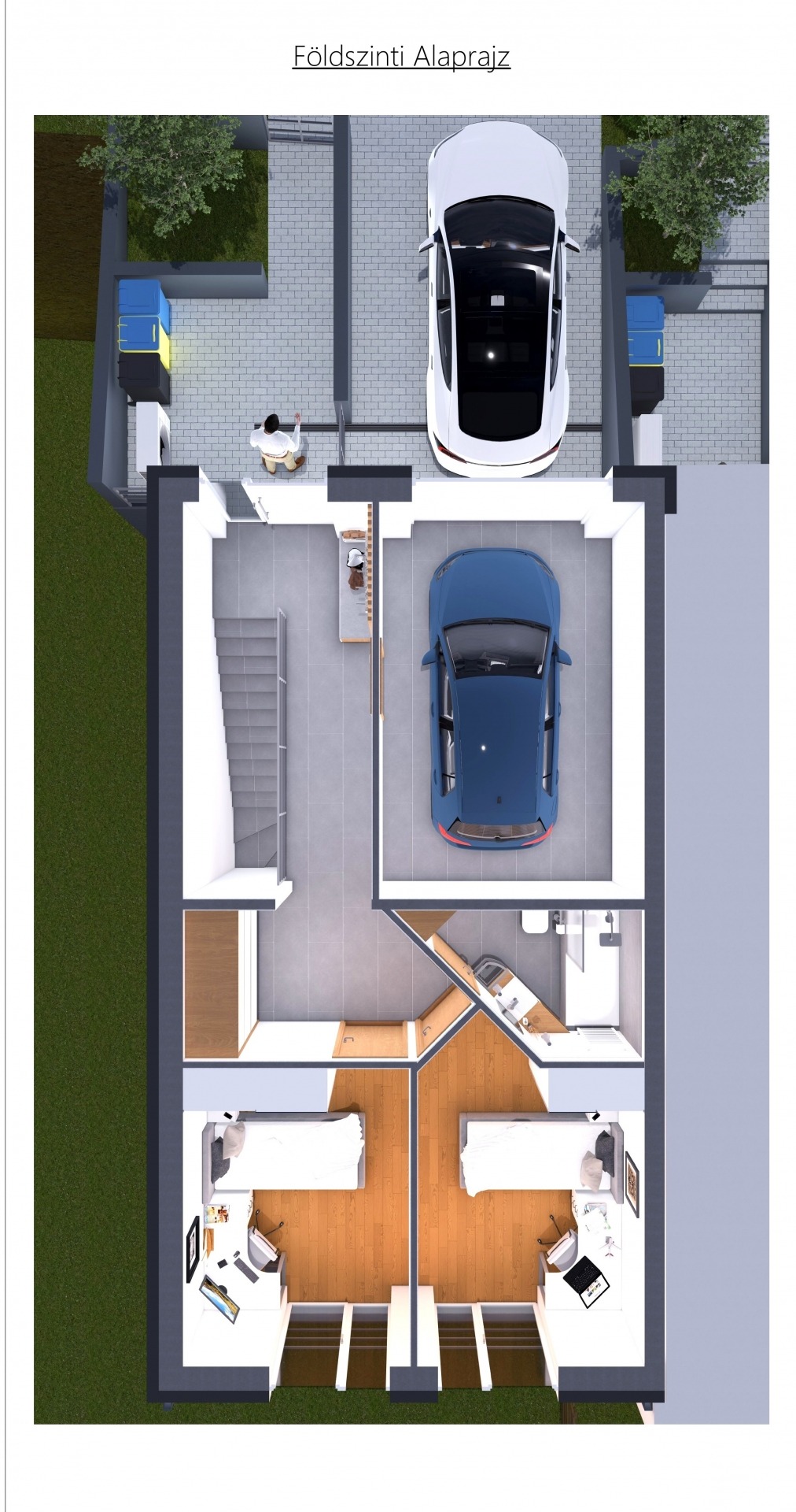 FÖLDSZINT (55,5nm): 2 szoba, fürdőszoba, közlekedő, előtér, garázs